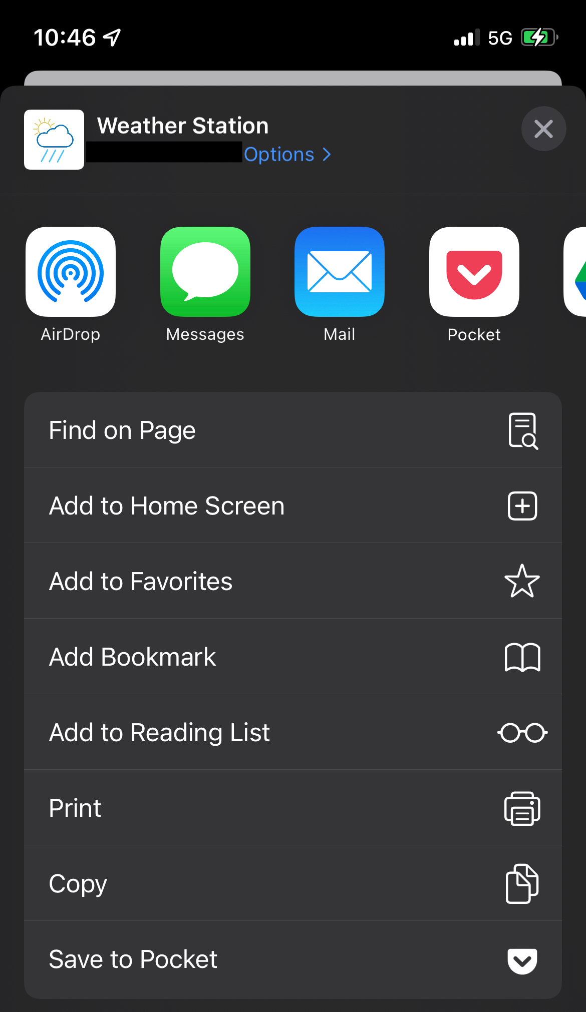 Go to the Weather Station home screen. Tap the "Share" icon in the bottom bar (box with arrow pointing up) to open the share menu.